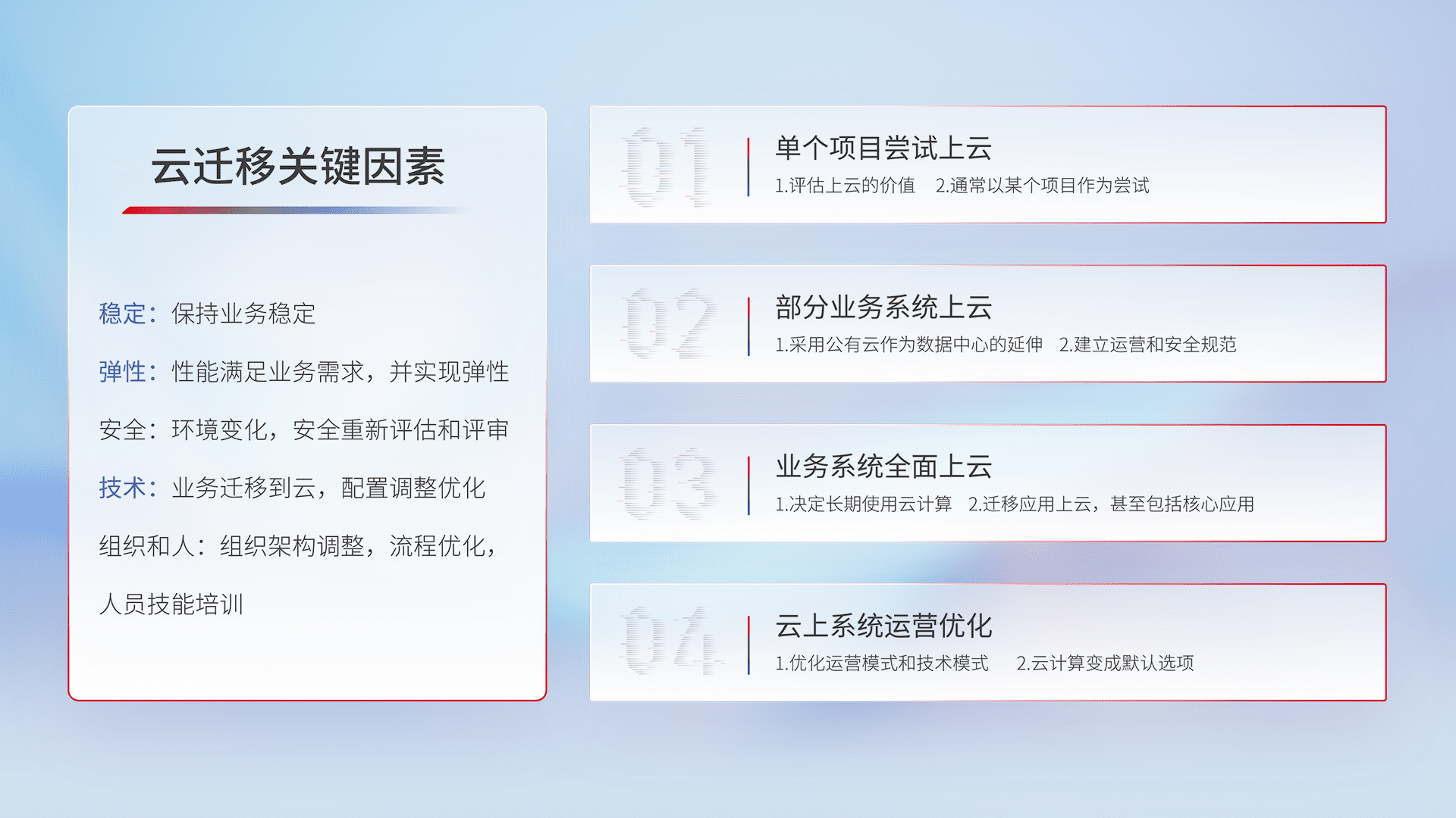 结合实际业务,,,从规划设计、、、、云平台选型、、、、云原生改造、、、数据迁移、、集成交付,,,迁移全过程为客户识别最佳上云路径,,,做好风险识别管理,,,,设计网络架构、、、、身份权限、、安全审计合规、、操作审计、、、日志审计、、监控告警策略、、、、多站点容灾设计等,,,对云上基础设施进行整体规划,,提升IT治理水平,,,,以满足弹性、、高可用、、高性能的需求。。。。